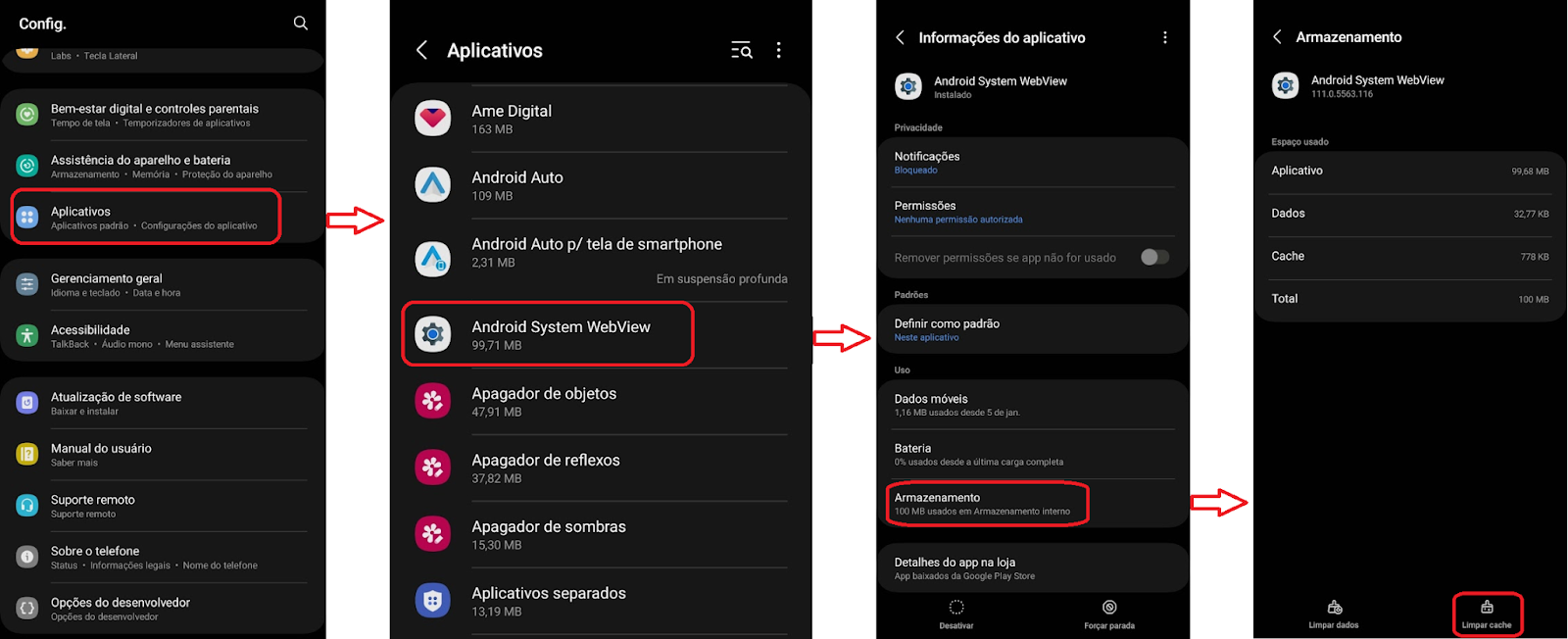 Configurações > Aplicativos > Android System WebView > Armazenamento > Limpar cache